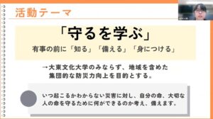災害発生時だけでなく、日頃からリスクマネジメントに対する意識を高めることの重要性や大学と地域との連携の意義について考える機会となりました。
