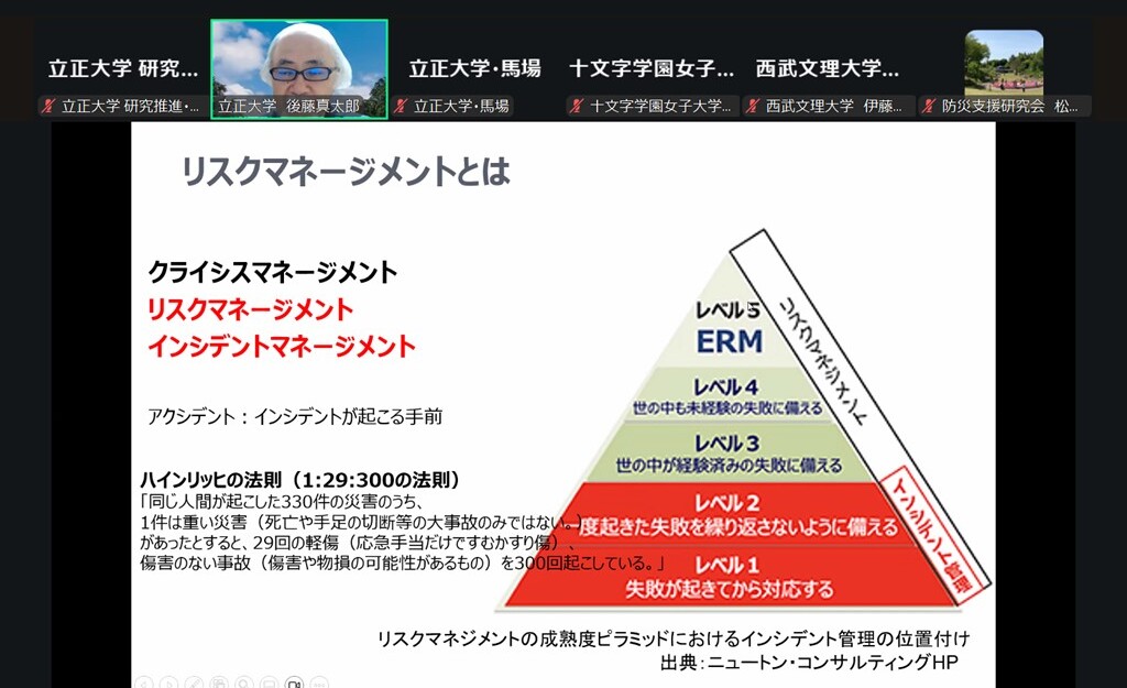 第一部では、立正大学地球環境科学部後藤真太郎教授より防災・減災・リスクマネジメントに関する講演をいただき、第二部では地域交流委員会所属大学の教職員・学生および地域活動事業者の皆様から、それぞれが取り組んでいる活動について紹介がなされました。その後、発表者を中心に地域のリスクマネジメントにおいて大学が貢献できる役割などをテーマに意見交換が行われました。