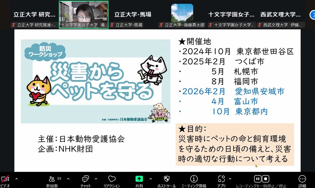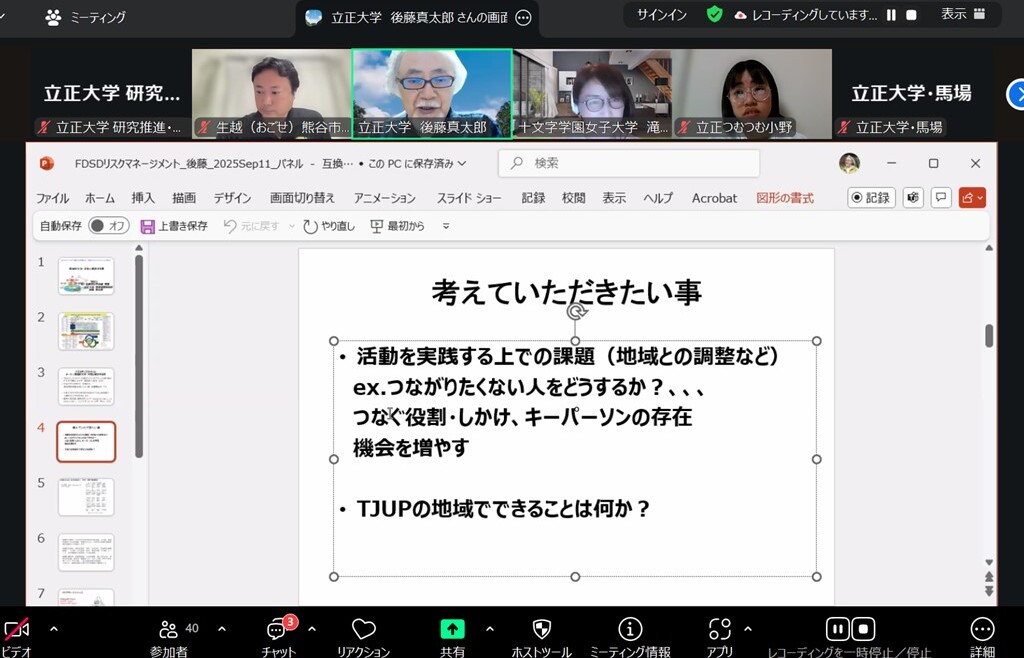 2025年9月11日(木)に、埼玉東上地域大学教育プラットフォーム(TJUP)地域交流委員会共同FD・SD『災害時のリスクマネジメントについて考える』をオンライン(Zoom)にて開催いたしました。(運営スタッフ2名、講師9名、参加者30名の計41名)