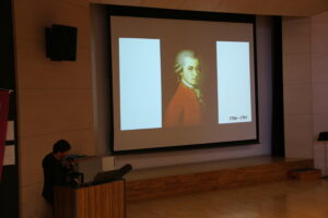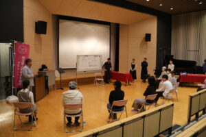 3大学8名の学生の参加があり、東邦音楽大学音楽学部 益田善太専任講師より、モーツァルトの幼少期の様子・創作の背景となる曲の内容や時代背景について、映像・音声を使ってわかりやすく講義が行われ、モーツァルトへの理解が深まりました。後半は一人ひとりフルートを使って、指使い・息の吹込み方や角度を丁寧に教わり、最後に全員で合奏を行いました。
